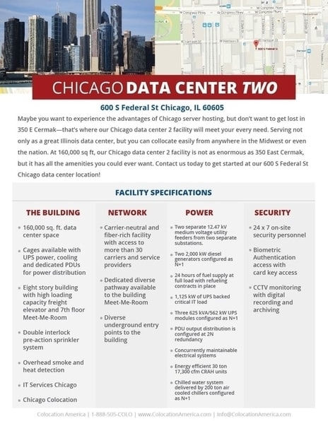 Maybe you want to experience the advantages of Chicago server hosting, but don’t want to get lost in 350 E Cermak—that’s where our 2nd facility will meet your every need. Serving not only as a great Illinois data center, but you can collocate easily from anywhere in the Midwest or even the nation. At 160,000 sq ft, this facility is not as enormous as 350 East Cermak, but it has all the amenities you could ever want. Contact us today to get started at our 600 S Federal St Chicago data center location!