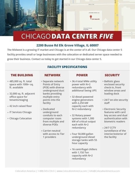Colocation America’s 3rd Chicago facility is located outside the congested city, sitting at 800 E Business Center Dr Mt. Prospect, IL 60056, this data center in Chicago is not really that at all—but it still gives you everything you need. Power, cooling, bandwidth, you name it and our facility will have it. So whether you’re looking for Chicago server colocation, or just want to get some Chicago Colocation pricing, contact us today!