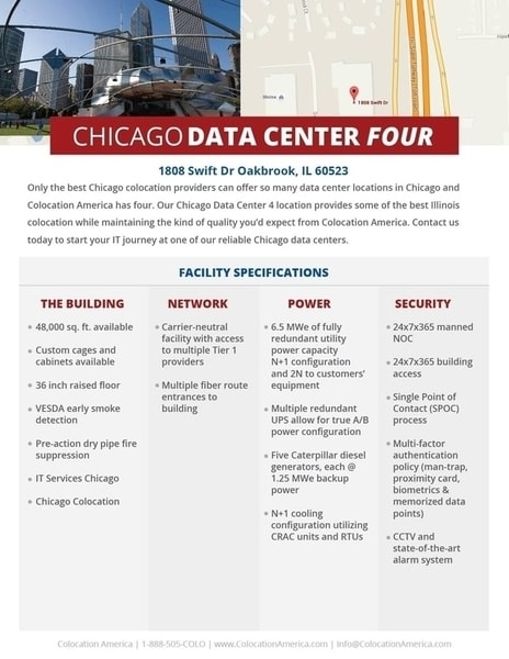 Only the best Chicago colocation providers can offer so many data center locations in Chicago and Colocation America has four. Our Chicago DC location provides some of the best Illinois colocation while maintaining the kind of quality you’d expect from Colocation America. Contact us today to start your IT journey at one of our reliable Chicago data centers.